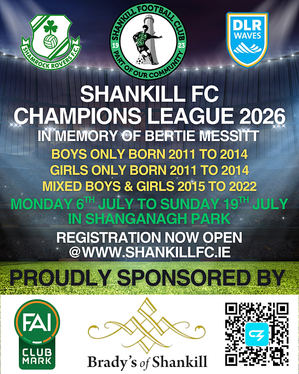 Registration for our Champions League Tournament is filling up very fast. Open to boys & girls born in 2011 to 2022 including a dedicated girls section for girls born in 2011/2012 & 2013/2014. Also a discounted price for Academy children, both members and non members for boys & girls born in 2020 to 2022. Demand is at an all time high this year after last year's huge success, where over 600 players competed for Champions League glory. Late booking fee of €15 per person applies to registrations made after 31st May. We look forward to welcoming you all for this year's tournament. To secure your child's place visit https://shankillfc.clubzapevents.com or scan the QR Code.